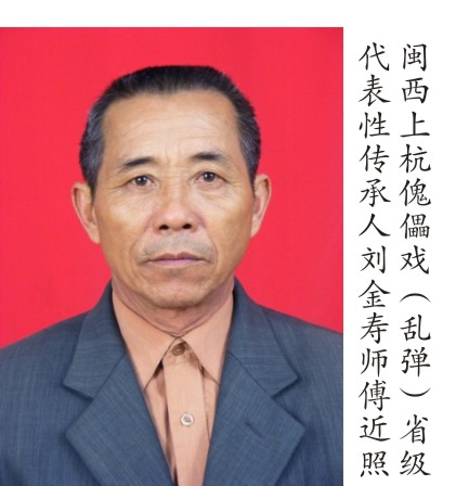 刘金寿,男,汉族,1949年1月出生于上杭县白砂镇大田村。1960年至1962年,随父刘锦丛(著名木偶表演艺术家,1954年曾晋京怀仁堂为国家领导人献艺,获特种艺术奖演员)学习傀儡戏表演技艺。学徒期间,以父为师。在父亲的言传身教下,及团内丘必书等各位名师的不断调教下,勤学苦练,打下了扎实的基本功。