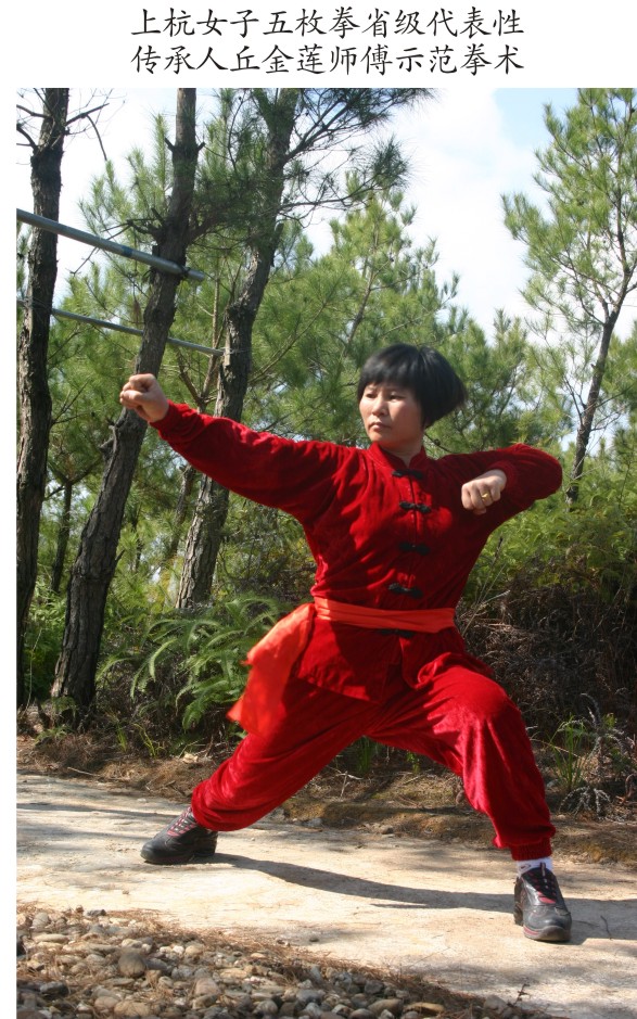 上杭女子五枚拳为中国武术稀有的拳种之一,据说在北方已失传。丘正元和梅花将五枚武术带到南方,已传闽、粤、赣三省。该拳术属于中部夺路之拳,核心是五枚拳软桩绝命八法,属儒家打法,即文拳,在武学研究上具有重要意义。