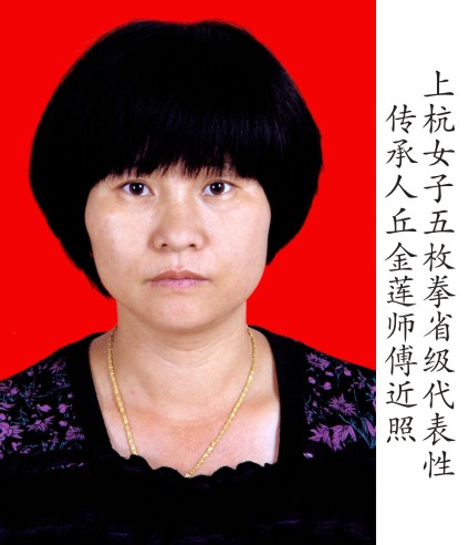 丘金莲,女,汉族,1966年6月27日出生,上杭县中都镇古基村人。1982年始,师从丘福华、丘振衡、丘维福等老拳师,加入上杭县中都镇古基女子五枚舞狮队学习五枚舞狮、五枚拳术、棍术及各种器械,并与队友前往邻近乡镇、县市参加演出、比赛得到好评。古基女子五枚舞狮武术队自1982年组建以来,农家姑娘们以矫健身姿和高超武艺,常令观众倾倒。1984年,丘金莲在上杭县举办的“庆祝建国35周年文艺调演”中,首次亮相就获得“推陈出新”奖旗一面。